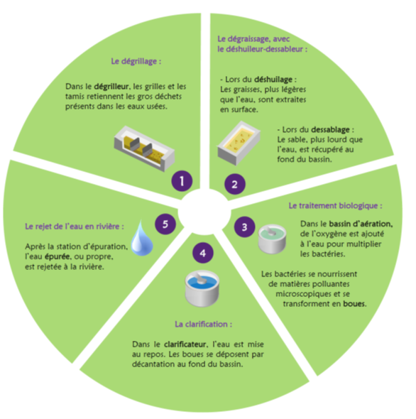 Les eaux usées sont collectées en assainissement collectif, si ta maison n’a pas de fosse septique et que la ville dans laquelle tu habites est dotée d’une usine appelée station d’épuration. Dans cette usine, l’eau traverse plusieurs bassins pour être nettoyée et devenir propre, avant d’être rejetée à la rivière.