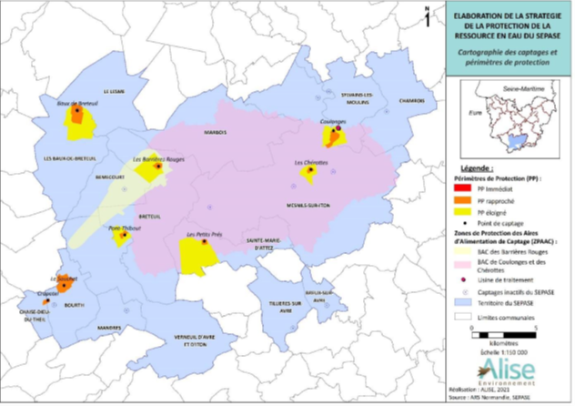 En complément de ces périmètres de protection, deux Zones de Protection des Aires d'Alimentation de Captages, aussi appelées Bassins d'Alimentation de Captages (BAC), ont été définies par arrêtés préfectoraux pour 3 de mes points de captages :
