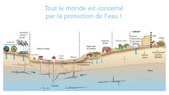Par ailleurs, des lois et règlements sont en vigueur pour protéger mes ressources en eau. Ainsi, des D.U.P. (Déclarations d'Utilité Publique) ont rendu obligatoires des périmètres de protection autour de l'ensemble des forages d'eau destinée à la consommation humaine.