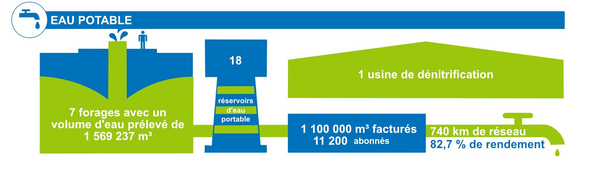➡️ En matière d'eau potable, cela veut dire la gérer de A à Z : du forage où je la prélève, au château d'eau où je la stocke, et jusqu'à votre robinet où je la distribue.